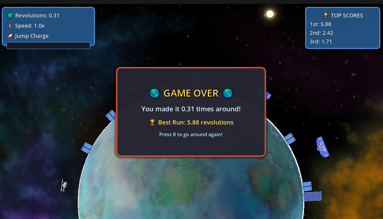 Overall, I spent more time on it, and got a lot more done than I expected! Total time logged was just under 10 hours, and I got all of my "stretch" goals done, and even more! I didn't think I would be able to add sound effects, add a leaderboard, write original music, and create original art for the character animation and obstacle, but I pulled through. It was a lot of fun, and I'm looking forward to participating in another jam. Maybe team up with someone more keyed into the audio or visual side.
